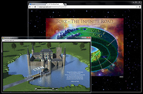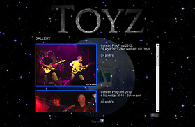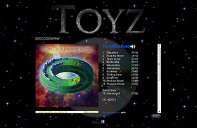 Based on the artwork for the CD, a Toyz Universe was designed for the homepage, where the navigation buttons took on the shape of planets revolving in 3D around a central sun (page needs the flashplayer to be installed).